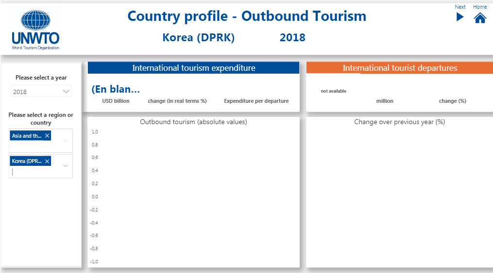 Como se observa en la siguiente imagen, no se puede encontrar información respecto al turismo en Corea del Norte desde la página oficial de la Organización Mundial del Turismo, a pesar de ser uno de los países miembros.